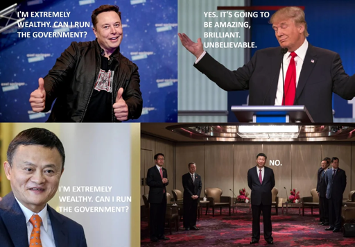 In America, the rich controls the government - to screw everyone else in the country (and sometimes those outside). In China, the government controls the rich - to screw everyone else in the country (and sometimes those outside).