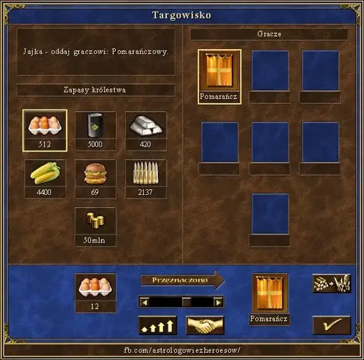 Image styled to look like a screenshot from the game Heroes of Might and Magic 3 in Polish. It shows a player giving a dozen eggs to the orange player.