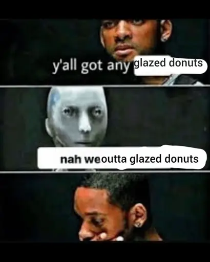 minus-squareTheTux@lemmy.mllinkfedilinkarrow-up11·1 year agoI said “well you got any jelly donuts?” He said “NAAAh we’re out of jelly donuts!” I said “you got any Bavarian cream filled donuts? He said " NAAAh we’re out of Bavarian cream-filled donuts!” and so on