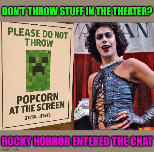 minus-squareMister Neon@lemmy.worldlinkfedilinkarrow-up15·11 months agoI hate the Rocky Horror Picture Show because I used to have to clean the theater I worked at after midnight showings of the movie.