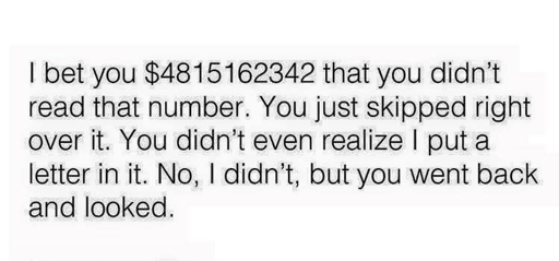 This one has never worked for me, because if I see a long number without commas or periods I have to stop and figure out. I couldn’t hope to read that number until I solved to puzzle of whether is started with “million” or “billion.”