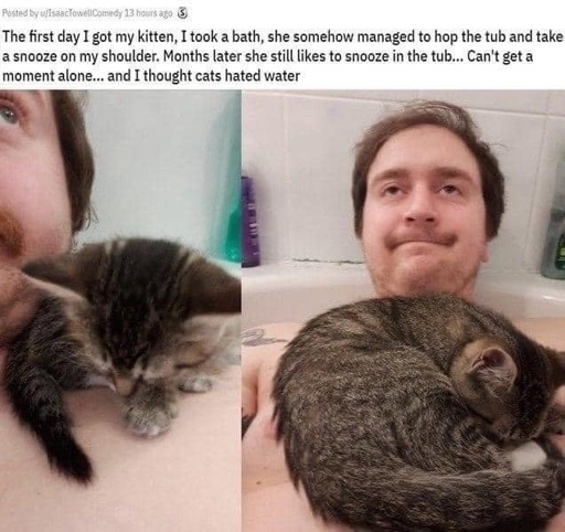 Cat learnt human bath time meant cat sleeping on the shoulder time, cat will sleep on the shoulder every time the human takes a bath, water or not, because that’s how reality works now in her world.