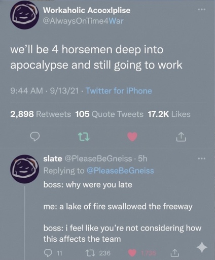 I had a boss at my first office job that lived across the street from the office. A literal blizzard hit and he still insisted we all come in. I tried my best, but there’s only so much I can control. I left 1 hour early knowing it would take forever and I was still going to be late. I should have said fuck it and called off work, but I was young and stupid, so instead I called in to let them know I’d be late. When I got there I got an ear full about how it wasn’t that bad and he made it in just fine. I showed him a photo of all the snow piling up 5-10 feet along the roadside as it blew in from the cornfields. He acted like I must live in Alaska or something. Like bro how long have you lived here and you don’t know this is a possibility?