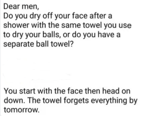 minus-squarenull_dot@lemmy.dbzer0.comlinkfedilinkEnglisharrow-up2·5 days agoLadies, do you have a special towel to dry your ass crack?