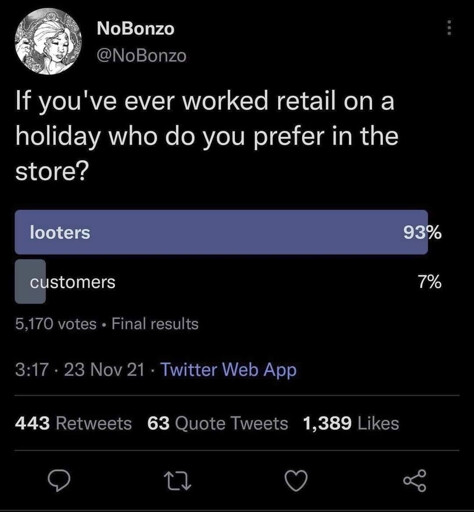 Sure, looters aren’t asking me to lie about how it looks on them, nor scan and check them out and print a gift receipt, and I don’t have to wrest off the shoplifting clamp-tag, they’ll take care of it at home. Other shoppers see a crowd and think we’re incredibly popular so they come in and buy whatever is left. … Profit!