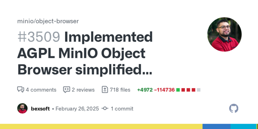 arrow-up10arrow-down1external-linkMinio strips away almost all features from AGPL interface and suggests people use their licensed "AIStor" service insteadgithub.comqaz@lemmy.world to Selfhosted@lemmy.worldEnglish · edit-210 months agomessage-square2fedilink
