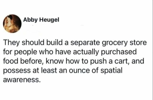 Bruh, I got autism. This person decided to create a hypothetical grocery store instead of just saying “what’s the deal with people in grocery stores? Why are they always in my way?”