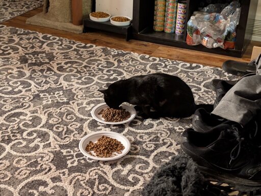 I do have 5 cats, but mostly I just put out a large selection of everything he seems interested in so he can graze on whatever he likes as he pleases.