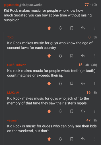 minus-squareGrail@multiverse.soulism.netlinkfedilinkEnglisharrow-up10·2 months agoGuys why is Kid Rock an adult