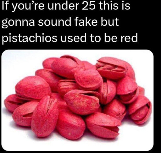 I’m 47 and have never seen this. I only remember pistachios in ice cream but they werent fucking red.