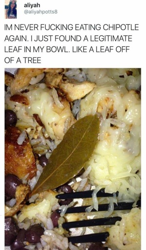 She doesn’t eat at Chipotle because she found a bayleaf in her burrito bowl…