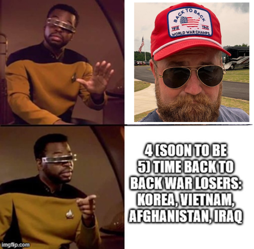 For those who had as much trouble parsing the second panel as I had: “Four – soon to be five – times back-to-back war losers: Korea, Vietnam, Afghanistan, Iraq”.