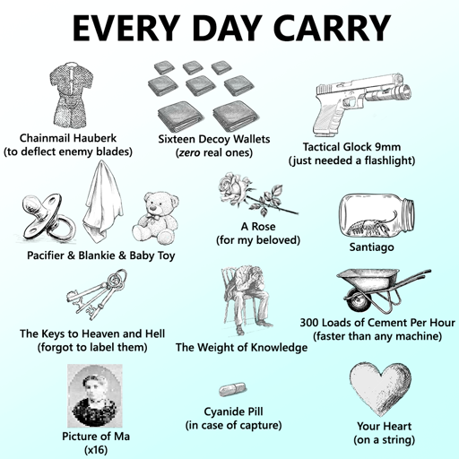 Pop culture kind of. The idea of having your “every day carry” list has been popular lately. Typically its things like keys, wallet, phone, multi tool, etcetera. So the meme is just that this person’s ever day carry is filled with insane shit.